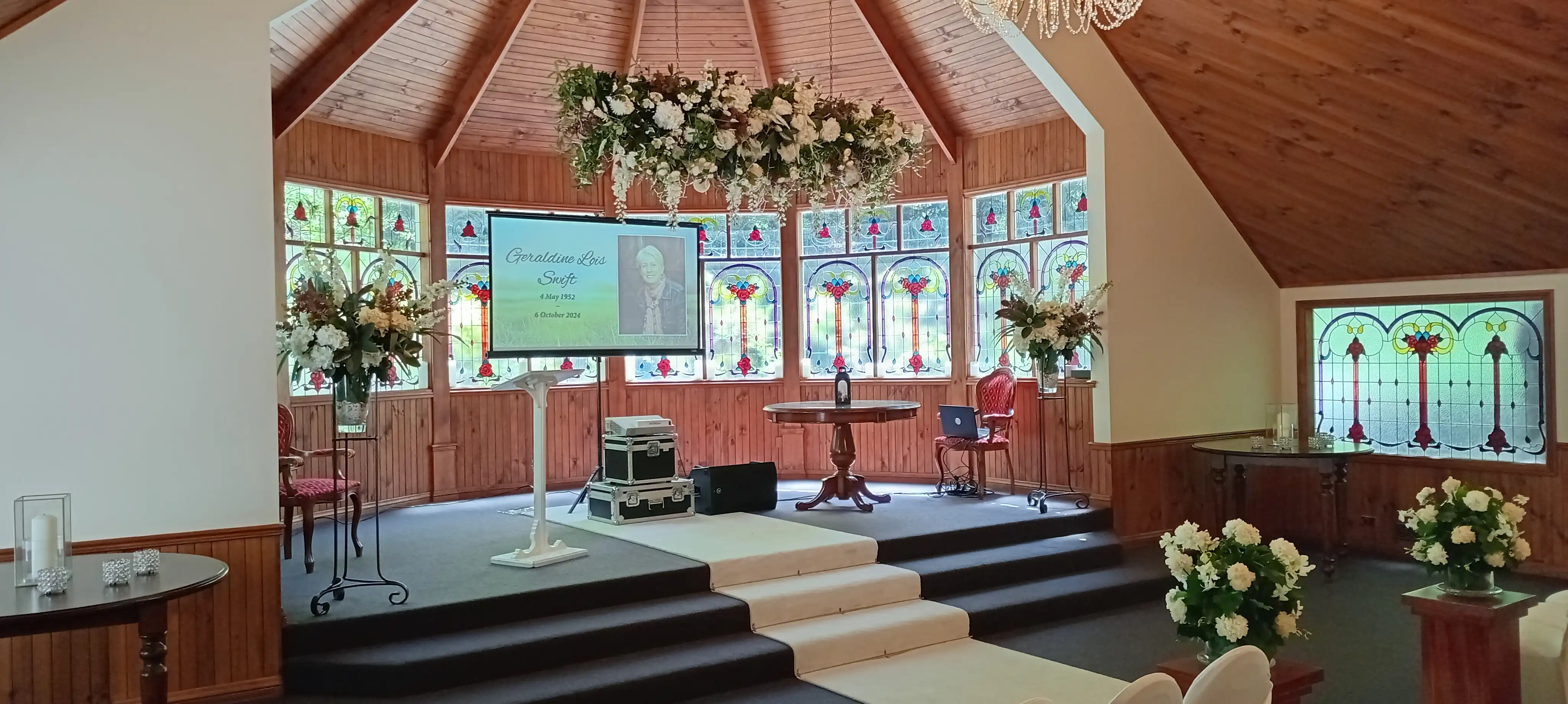 This includes a portable projector and high-lumen display system paired with a discreet, easy-to-assemble screen that adapts well to chapels, crematoriums, and graveside settings.