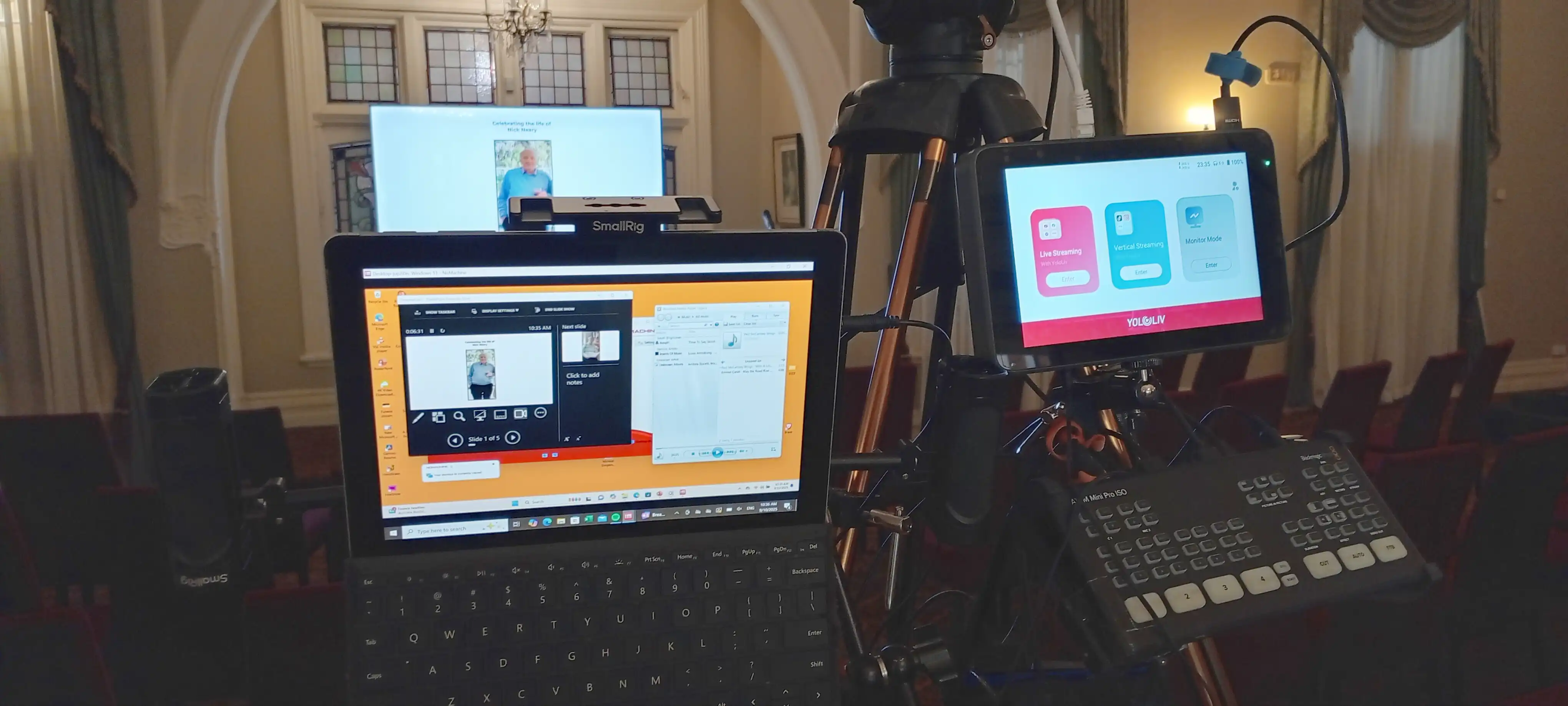 I operate a compact, professional-grade setup designed specifically for flexibility and reliability within funeral venues.